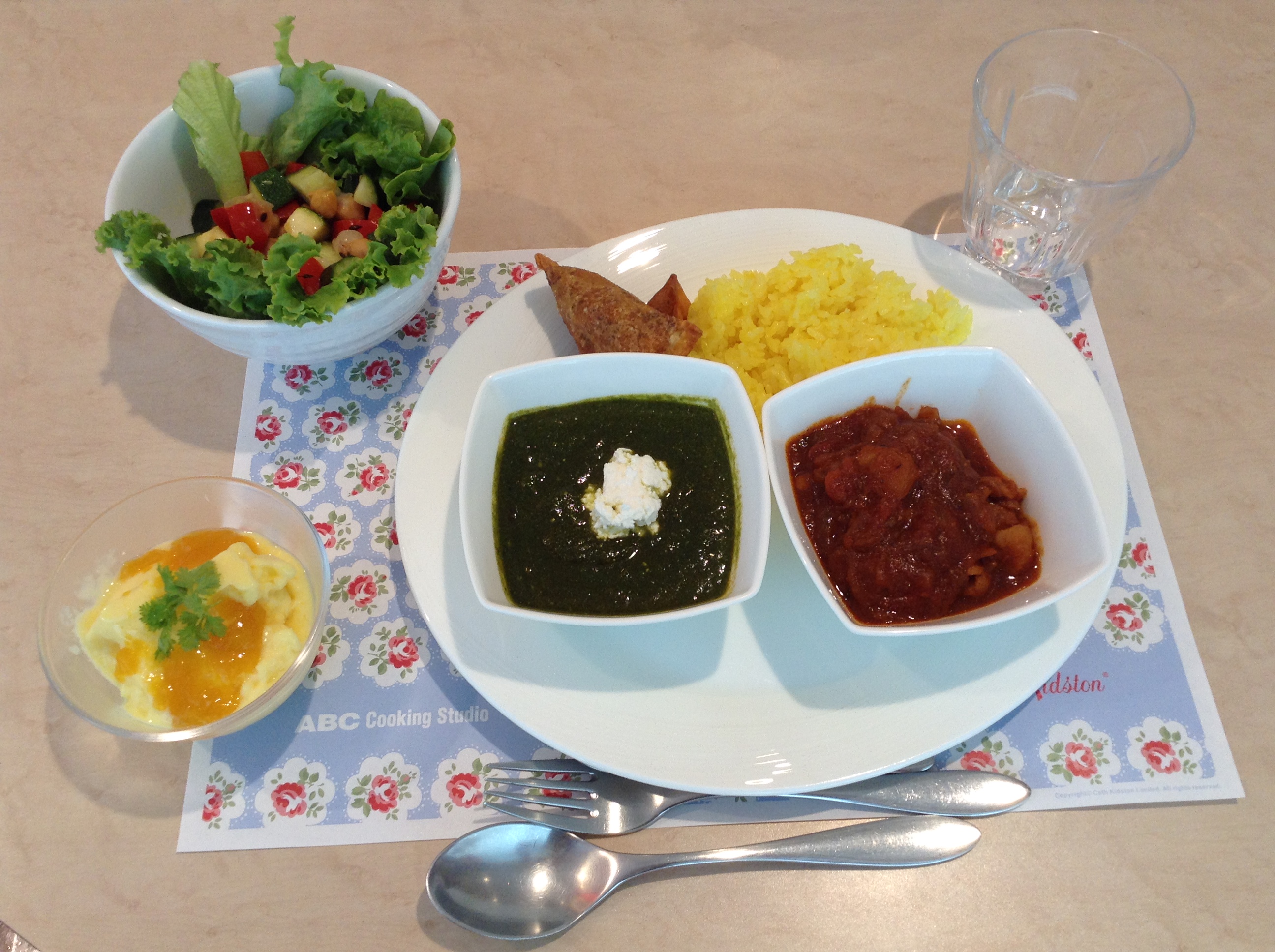 Today I took a cooking lesson instead of baking. We tried our hands at cooking Indian cuisine. We ended up making two kinds of curry (the one on the left is spinach based), along with samosas, turmeric rice, a fresh salad with zucchini, chick peas, etc., and a mango sorbet as dessert.